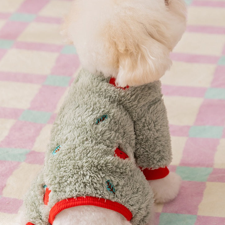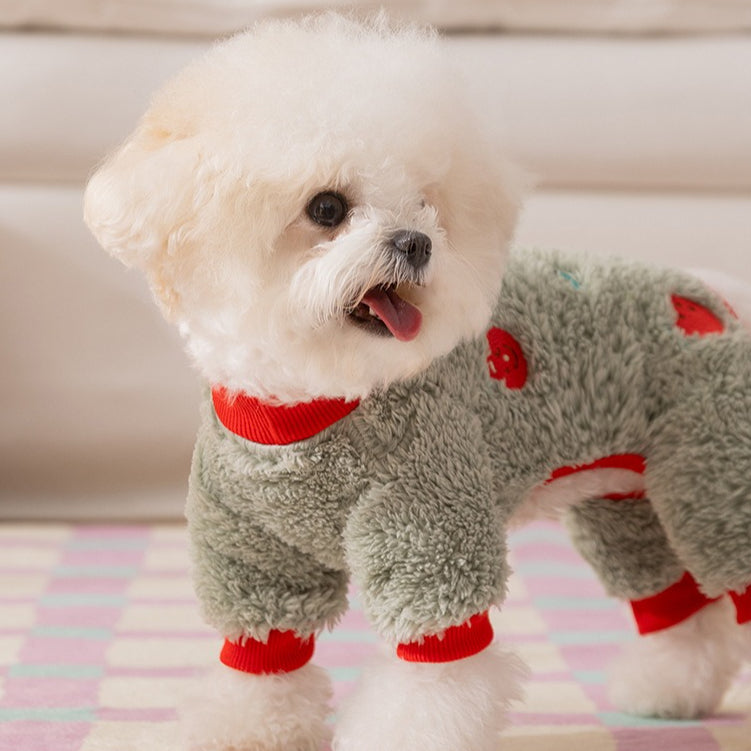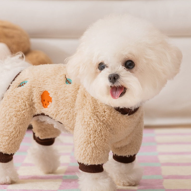 Brave the cold in adorable style! This Cartoon Fruit Dog Hoodie isn't just clothing—it's a head-to-toe winter adventure for your furry friend. Featuring a vibrant all-over embroidery of cute fruits and a cozy hood, this plush four-legged suit offers complete coverage, turning your Teddy or Bichon into the most fashionable and snug little explorer on chilly days.