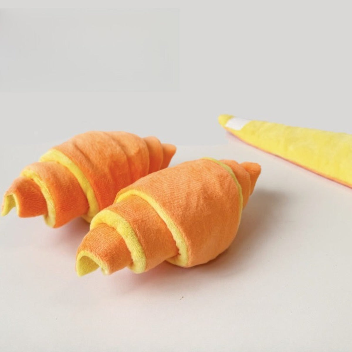 Shaped like a delicious croissant with soft, curly “pastry” texture, this plush toy is irresistibly cute and tactile—perfect for carrying, cuddling, and gentle chewing.